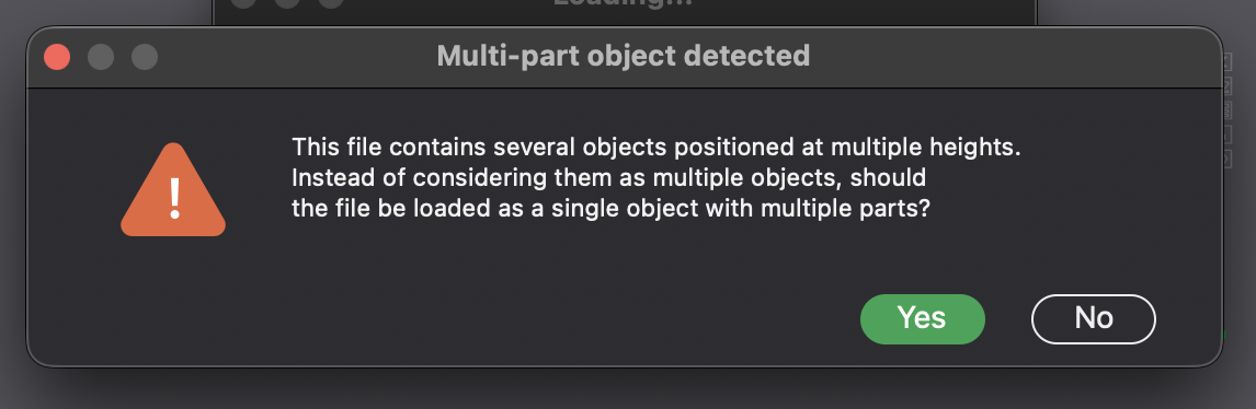 Click Yes. The file contains two objects at different heights — a white base plate and a black QR layer on top. Saying Yes loads them as a single multi-part object and keeps the dual-color filament assignments intact. Saying No would separate them and lose those assignments.